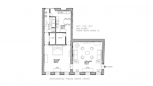 Second floor apartment, 25 steps up to the entrance with the option of a chair lift. Large windows overlooking the piazza and the Santa Croce Basilica, features Trompe l’oeil decorations in the master bedroom and a generous living room with three beautifully 17th century frescoed walls and a day bed for guests. The Loft includes a fully equipped kitchen with washing machine, dryer and dishwasher.