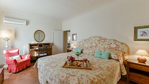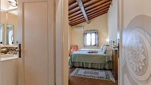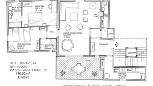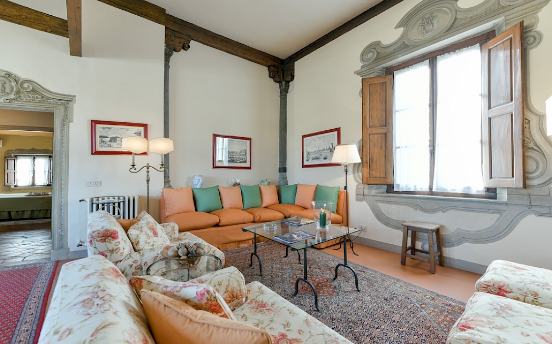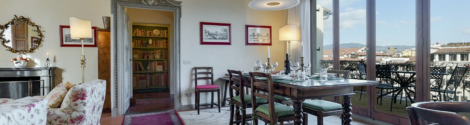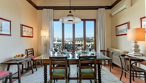 This light-filled penthouse beauty just off the elevator offers stunning views of architectural treasures and the surrounding hills from every window. Floor-to-ceiling glass doors open onto a gracious terrace overlooking Piazza Santa Croce The living and dining room, with working fireplace, tromp l’oeil, and lovely, comfortable furnishings retain the structure and the columns of the Palazzo’s Renaissance loggia.