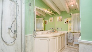 Arched French doors open from the yard to a lovely living room, with wicker sofas, stone floors, exposed wood ceiling beams, and fireplace. Savor aperitivi by the fire, prepare classic Italian feasts in the stunning kitchen, and join each other around the six-person dining table beneath the gorgeous chandelier. After dinner, repair to the billiard room for a game of pool and a fine digestivo from the deluxe bar. In the morning, refresh your body in the private spa, with sauna, Jacuzzi, and steam bath.