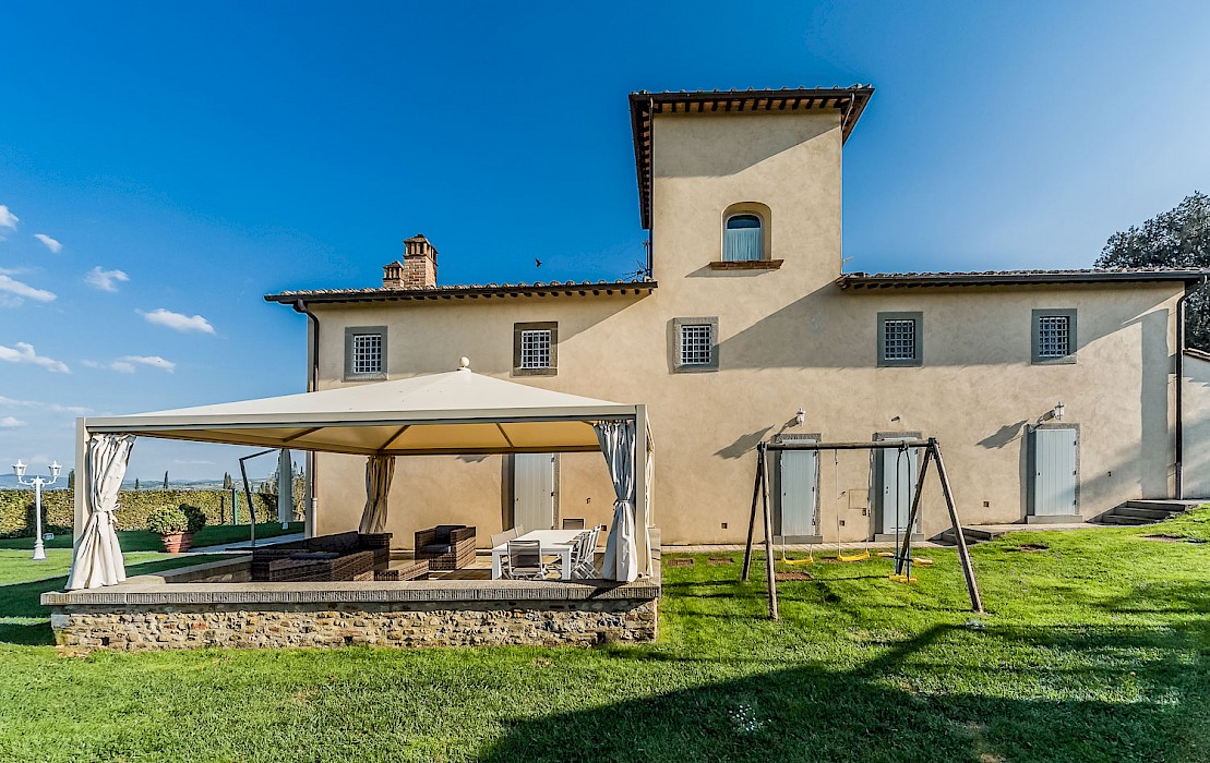 The gorgeously landscaped estate welcomes you with an enchanting pathway flanked by cypress trees, while lovely lemon and olive trees populate the gardens. Down a flight of stone steps from the villa's back entrance, the swimming pool terrace features elegant loungers and parasols on a smooth stone deck overlooking the countryside. Savor a delicious soak in the jetted hot tub and plunge into the pool for a morning swim. Kindle the stone barbeque grill and enjoy an alfresco meal in the dining pavilion, paired with local wine. Linger in the lounge as the children play on the charming swing set in the afternoon light.