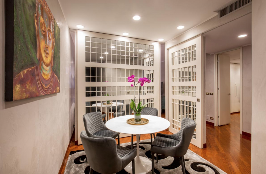 Total mq: 120 . The living area is fully furnished with stylish table, chairs and sofa with a breathtaking view over the Spanish Steps and close to the main city centre attraction such as Trevi Fountain, Pantheon. The “Piazza di Spagna 90” Luxury apartment is the perfect choice to live out the shopping and real Roman experience next to the most famous historical sites.