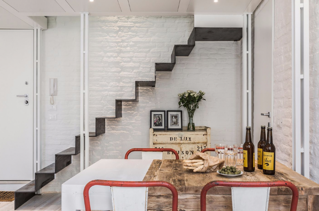 The smart lay-out of the apartment has been studied to optimize the use of the 60 square meters available: especially the mezzanine made with steel, wood and glass is a great idea to create a cozy relaxing area and most importantly to give access to the second smaller bedroom located above the living room. The style of the furniture is decidedly industrial-vintage and modern-Scandinavian. The clever use of neutral bright colors on parquet flooring, antique brick walls and wooden beamed ceilings in combination with colorful and playful interior details results in a very pleasant environment, appealing especially to contemporary art lovers.