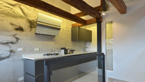 The Sagredo apartment has been carefully restored in 2014 using top quality materials and furniture. Some of the strengths are: the natural brightness guaranteed all year long by the many windows and Velux; the welcoming feeling conferred by the exposure of the antique wooden beams and the natural parquet flooring; the pleasant open view; the quietness and privacy granted by the top floor position; the comfort of the brand new amenities. Between other interesting pieces can be found a Carrara Marble Tulip table and chairs designed by Saarinen, a fully equipped and highly technological Ri-Flex kitchen by Veneta Cucine, brushed steel fittings and designer vanities in bathroom, stylish modern antiques recalling the 60's.